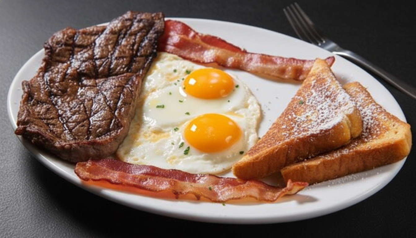 Pan tostado o pancackes, carne, huevos, tocineta.
